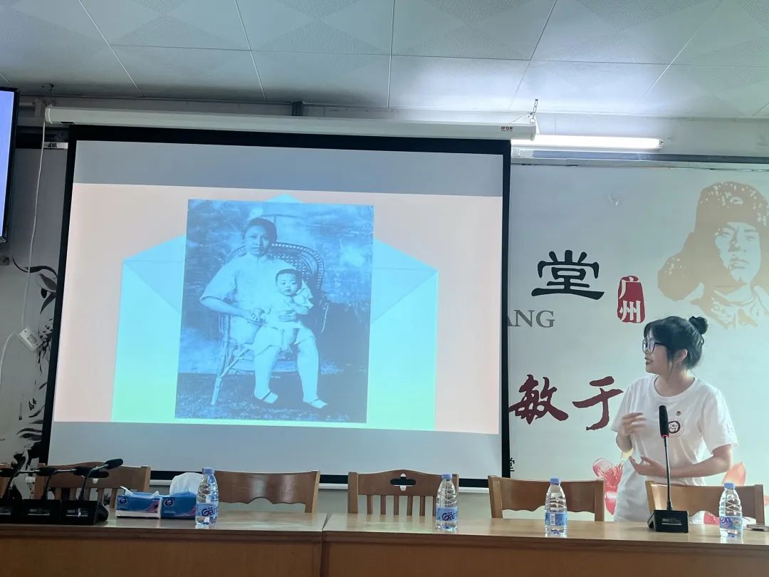 谢倩梅等同学以一张赵一曼母子合照为导入,讲述着革命女英雄赵一曼就义前为儿子留下的两封书信的故事。在成员的角色扮演朗诵下,我们感受到赵一曼写下“母亲不能用千言万语来教育你,就用实行来教育你”时的温暖亲情和革命精神。