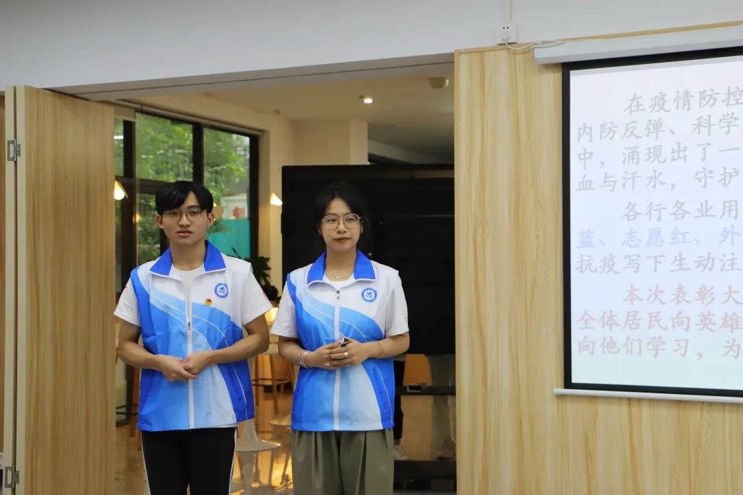 许嘉炜、张佩瑶同学以“幸福社区”疫情防控颁奖仪式的独特形式带领群众进入情境,“沉浸式”感受疫情防控过程中为人民群众安定生活而负重前行的暖心小故事,现场气氛十分融洽,社区群众们也积极说出自己心中的抗疫模范。
