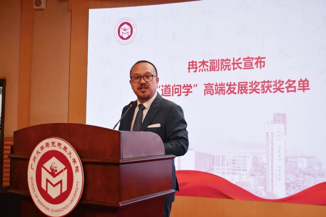 “道问学”指导奖获奖教师代表吴阳松教授发言。吴阳松首先对获奖同学表示衷心的祝贺。他表示,“道问学”奖项的颁发是对同学们在大学阶段的检验,证明了同学们在马院学有所获、学有所成。他提出,老师和学生如同一对辩证关系,同学们感谢老师的辛勤培育,老师也感谢同学们成就了自身的职业价值。他希望仍在求学路上拼搏的同学继续刻苦钻研,也寄语即将踏入工作岗位的毕业生们接续奋斗,实现人生价值。